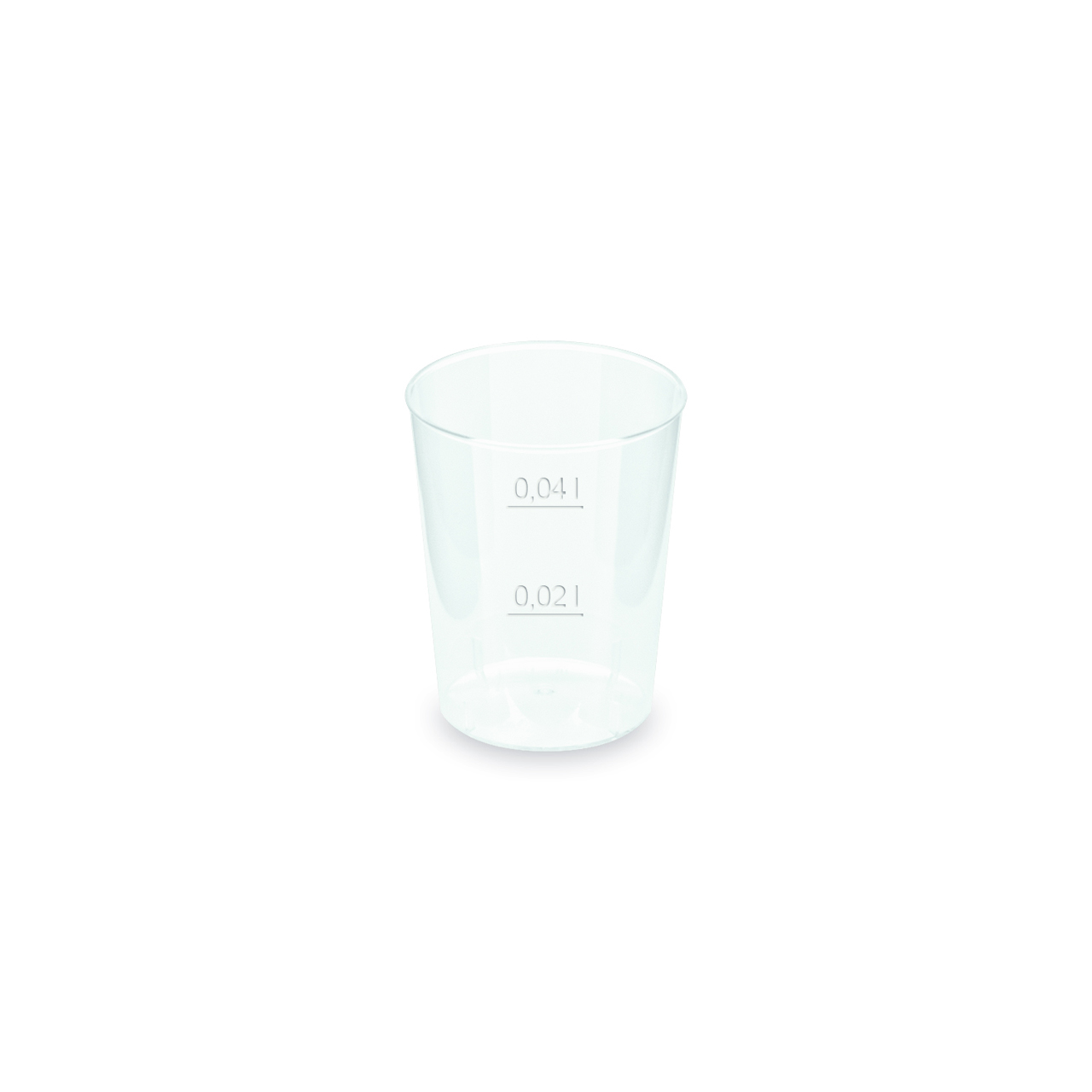 Mehrwegbecher (PP) mit einem Volumen von 0,02 / 0,04 l. Durchmesser: 43 mm.