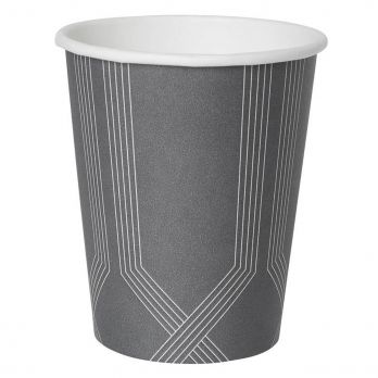 Pappbecher in grauer Farbe mit Dekor, Volumen 0,2 l. Material PAP/PE max +100 st C. Der Deckel ist nummeriert 100030611.