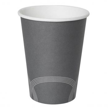 Pappbecher in grauer Farbe mit Dekor, Volumen 0,3 l. Material PAP/PE max +100 °C.