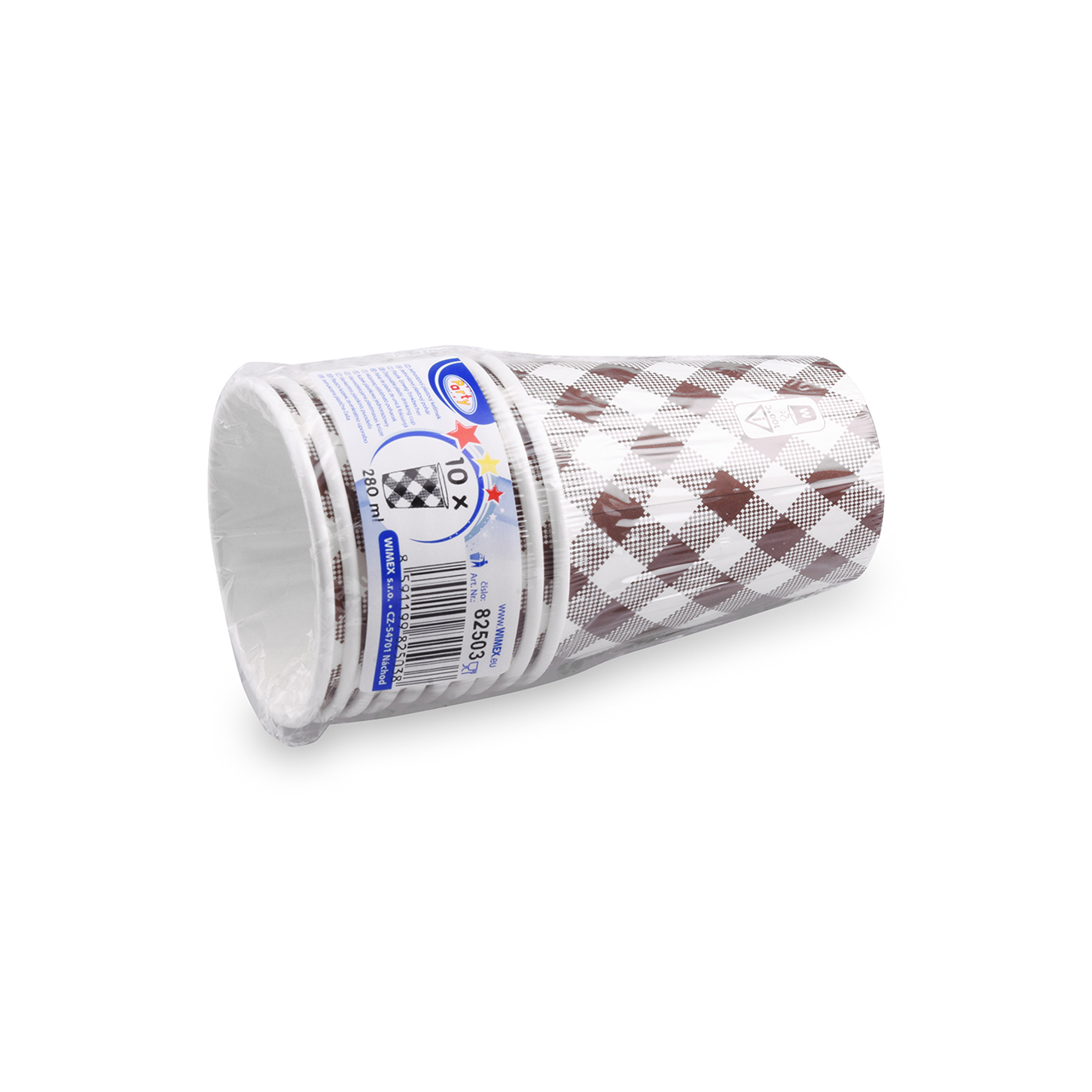 Pappbecher mit M-Aufdruck, Volumen 0,28 l, Durchmesser 80 mm. Eine passende Kappe finden Sie unter der Nummer 100004192 in Schwarz und 100017879 in Weiß. Enthält Kunststoff.