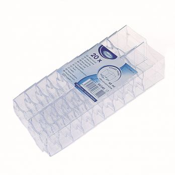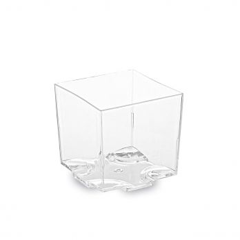Quadratische Einzelportionsschale/durchsichtiger Becher mit einem Volumen von 65 ml. Maße: 4,4 x 4,4 cm, Höhe: 4,3 cm. 20 Stück pro Packung.