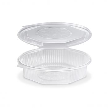 Menüschale (PP) achteckig transparent mit ungeteiltem Deckel. Spezifikationen: 21,5 x 22 x 5,7 cm. Volumen 1200 ml.