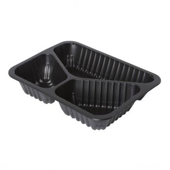 Cater Line 3-teilige Schüssel mit einem Volumen von 467 + 291 + 213 ml schwarz. Größe 22,7 x 17,8, Höhe 4,5 cm. Anwendungsbereich -20°C bis +100°C. Entwickelt für die Verpackungsmaschine DF10 (Nummer 100011682).