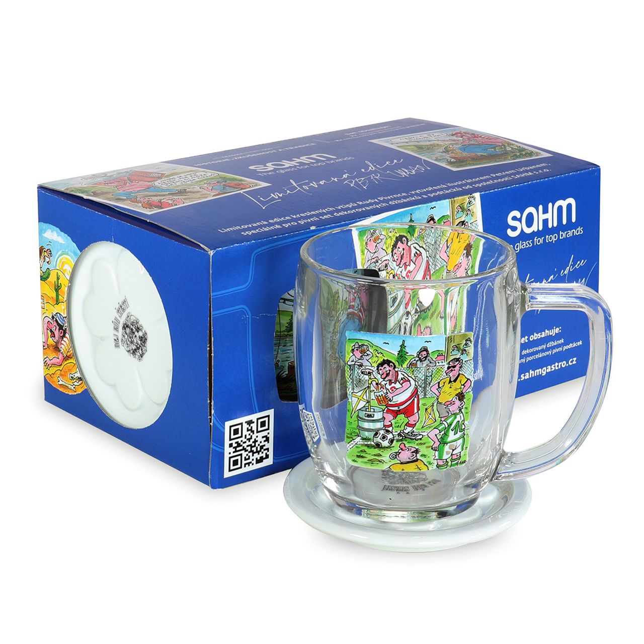 Das Set enthält 2 Stück VIENNA Seidel 0,5 l und 2 Stück Porzellan-Bieruntersetzer mit Dekor in einer Geschenkbox.
