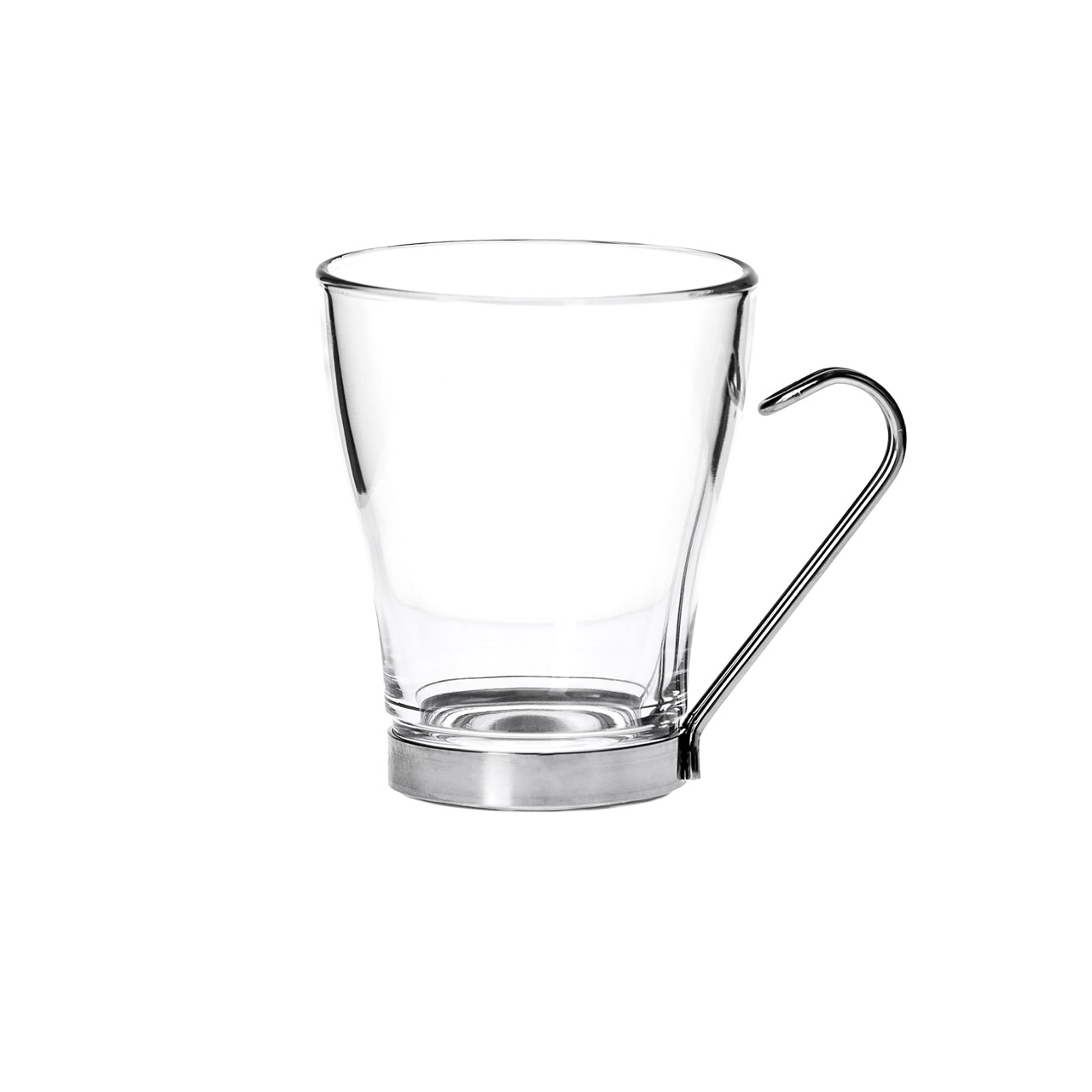 Ein Glasbecher mit Metallgriff und einem Ring am Glasboden mit einem Volumen von 0,24 l.