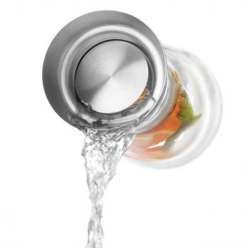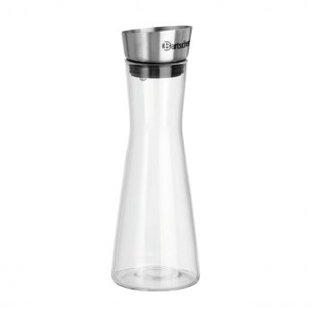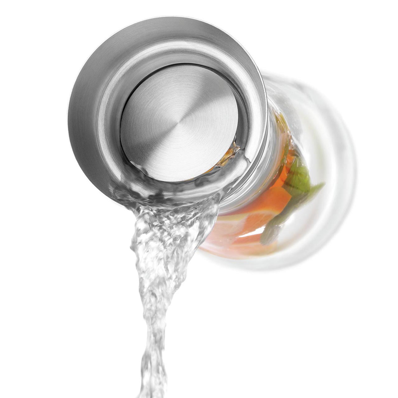 Glaskaraffe mit einem Fassungsvermögen von 0,75 Litern. Abnehmbarer Edelstahldeckel mit Ausgießmechanismus und Dichtungsgummi. Verschlussklappe, integriertes Sieb. Spülmaschinenfest. Maße: B 100 x T 100 x H 295 mm, Gewicht: 0,606 kg.