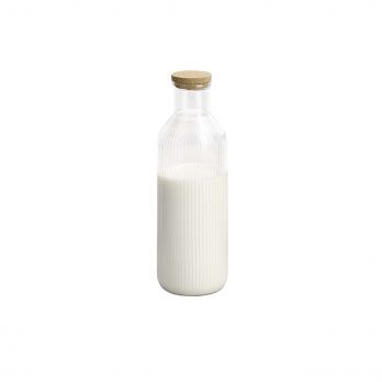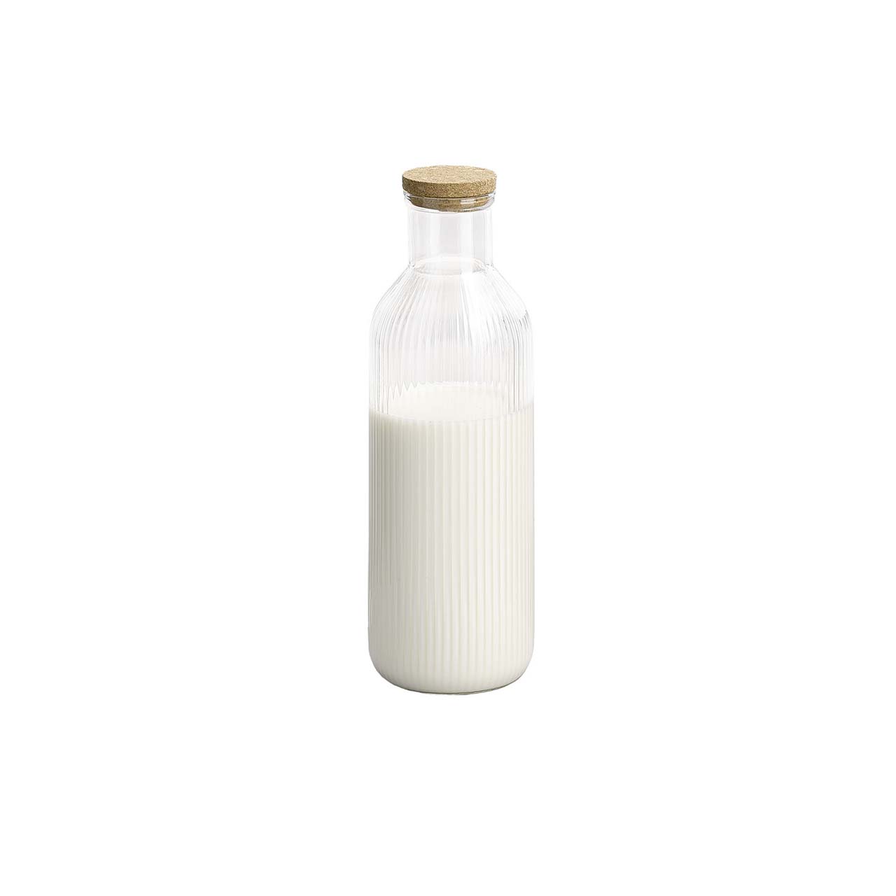 Elegante Glaskaraffe 1 l Volumen, Durchmesser 9cm, Höhe 27cm, mit natürlichem Korkdeckel, ideal für den privaten und gastronomischen Gebrauch. Perfekt zum Servieren von Milch, Säften, Wasser oder Limonade. Aus hochwertigem Glas gefertigt, pflegeleicht und mit zeitlosem Design, das jeden Tisch ergänzt. Passende Etikettenclips sind unter der Bestellnummer 100035429 erhältlich.