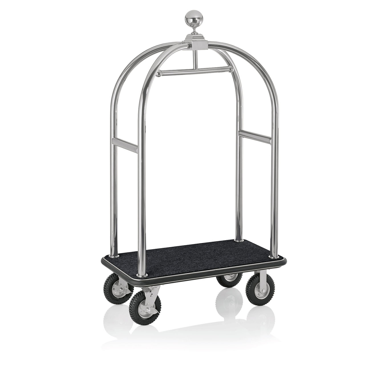 Gepäckwagen, 112 x 60 x 190 cm, silberfarben, verkürzte Ausführung, schwarzer Teppichbezug, Edelstahl 18/8 Chrom-Nickel. Geeignet für den Hotelgebrauch.