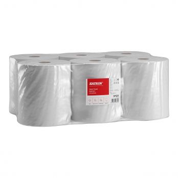 Hochwertige, zweilagige Papierhandtuchrolle Katrin M2 aus Zellulose. Die Rolle lässt sich von oben und in der Mitte abrollen. Farbe: Weiß, laminiert (die Laminierung – die Verklebung der Lagen – erhöht die Reißfestigkeit und Saugfähigkeit).