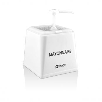 Praktischer Mayonnaisebehälter aus Kunststoff mit 2,5 l Fassungsvermögen, inklusive stabilem Ständer. Inklusive Pumpe. Eine Ersatzpumpe kann unter der Nummer 100031416 bestellt werden.