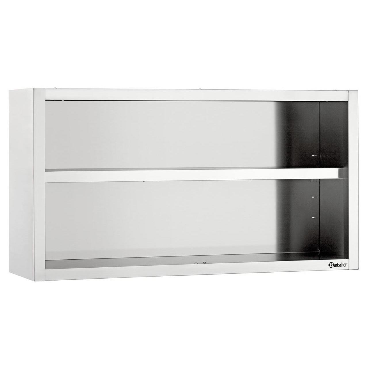 Hängendes Edelstahlregal zur Wandmontage. Material: Edelstahl. Ausgestattet mit einem höhenverstellbaren Einlegeboden, wodurch das Regal zwei Ebenen bietet. Innenhöhe: 580 mm. Abmessungen: B x T x H (mm).