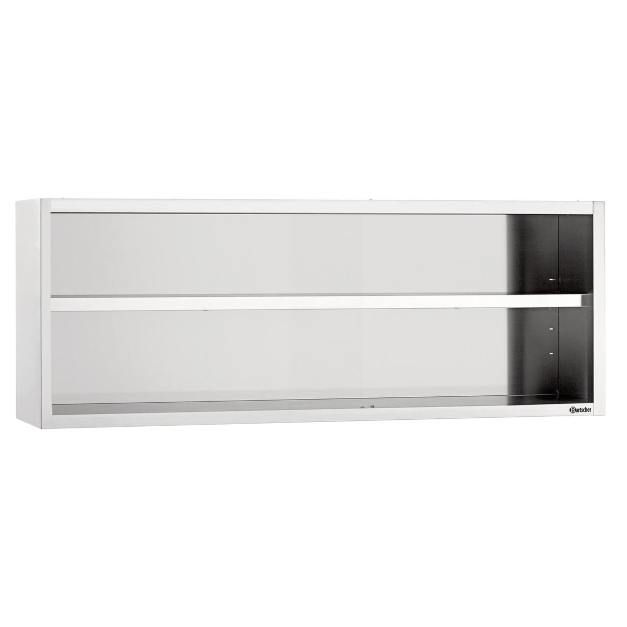 Hängendes Edelstahlregal zur Wandmontage. Material: Edelstahl. Ausgestattet mit einem höhenverstellbaren Einlegeboden, wodurch das Regal zwei Ebenen bietet. Innenhöhe: 580 mm. Abmessungen: B x T x H (mm).