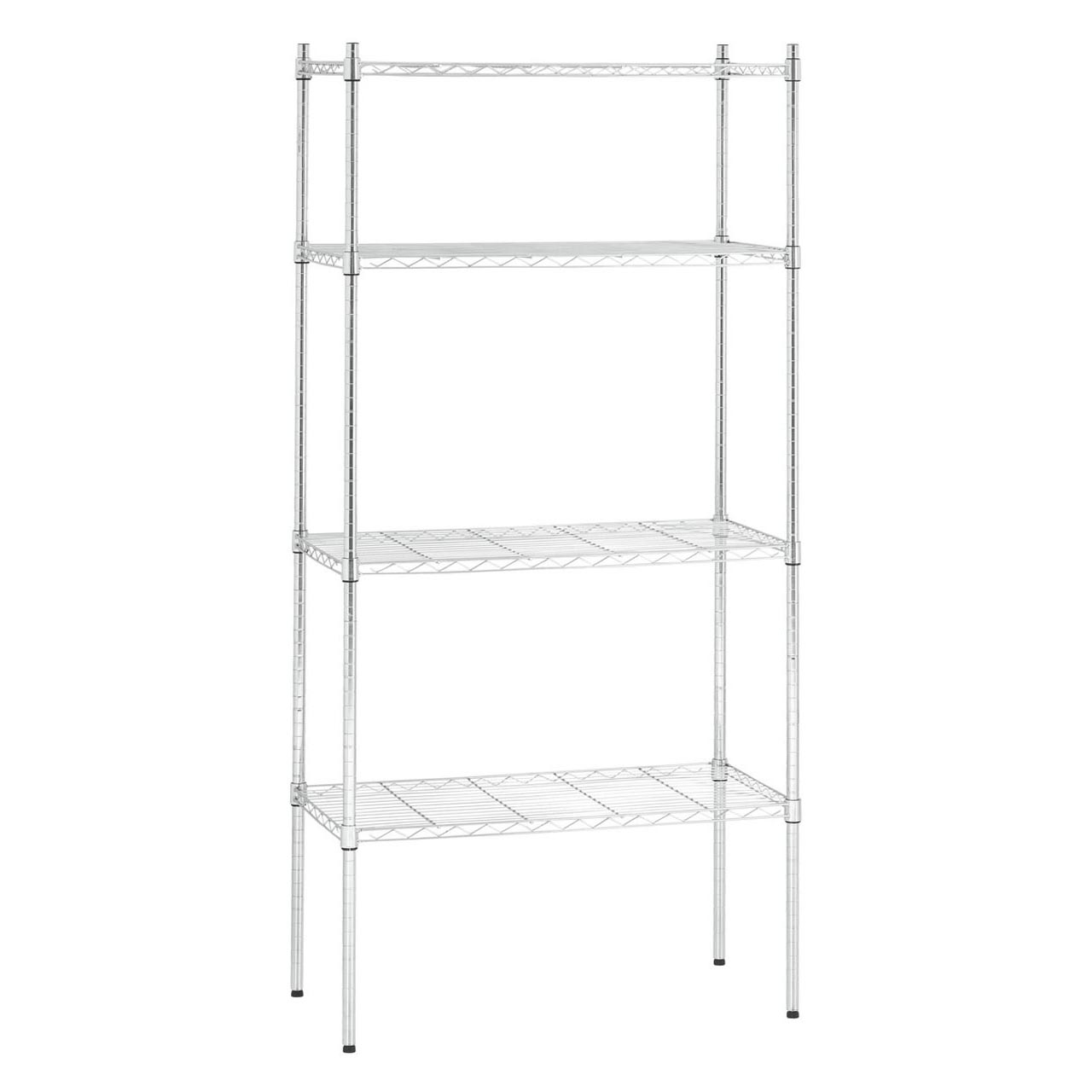 Regal aus verchromtem Stahl. 4 höhenverstellbare Regalböden. Das Montageset besteht aus 4 Regalböden und 4 Eckverbindern (Stecksystem). Einfache Montage.