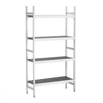 Regalsystem, 96 cm breit, für GN 1/1, GN 1, GN 1/3 und GN 2/3. Anstelle der Regalböden können Sie Gastrobehälter einsetzen. Maximale Tragkraft: 600 kg. Material: Aluminium. Inklusive Montagematerial. 2 Regalständer, 4 Ablageflächen mit je maximaler Tragkraft von 165 kg, Maße pro Ebene: B 902 x T 360 mm. 12 perforierte Regalböden aus Copolymer (ABS, SBS). Maße: B 960 x T 360 x H 1800 mm. Gewicht: 12 kg. Gastrobehälter sind nicht im Lieferumfang enthalten und müssen separat bestellt werden. Sie können Verbindungsstücke erwerben, um zusätzliche Regalböden miteinander zu verbinden oder das Regal im 90°-Winkel zu montieren.
