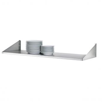 Robustes Wandregal. 1 Tellerablage und zwei Seitenwände. Inklusive Montagematerial. Einfache Montage. Material: Edelstahl. Verschiedene Längen, Maße (B x T x H mm) angegeben.