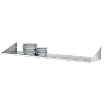 Robustes Wandregal. 1 Tellerablage und zwei Seitenwände. Inklusive Montagematerial. Einfache Montage. Material: Edelstahl. Verschiedene Längen, Maße (B x T x H mm) angegeben.