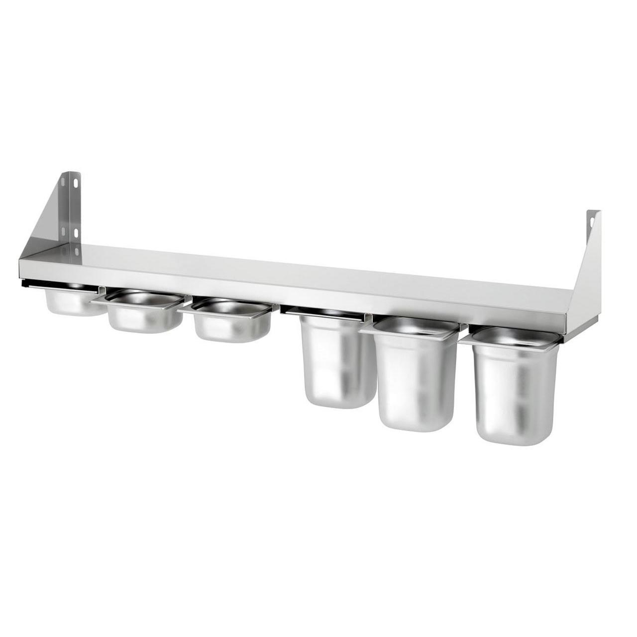 Bartscher Edelstahl-Wandregal für 6 GN 1/6-Behälter unterschiedlicher Tiefe. Ideal z. B. für Gewürze. Mit Einsätzen für GN-Behälter. Behälter separat bestellen. Inkl. Montagematerial. Maße: B 1200 x T 200 x H 150 mm. Gewicht: 4,3 kg.