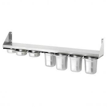 Gewürzregal aus Edelstahl für 7 x 1/6 GN-Behälter mit Verriegelungseinsätzen. Gastronormbehälter sind nicht im Lieferumfang enthalten und müssen separat bestellt werden. Abmessungen: B 1400 x T 200 x H 150 mm. Gewicht: 4,9 kg. Einfache Montage. Inklusive Montagematerial.