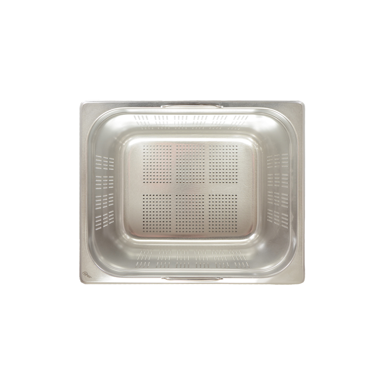 Perforierte Gastroschüssel GN 1/1 aus Edelstahl, Tiefe 65 mm mit versenkbaren Griffen.