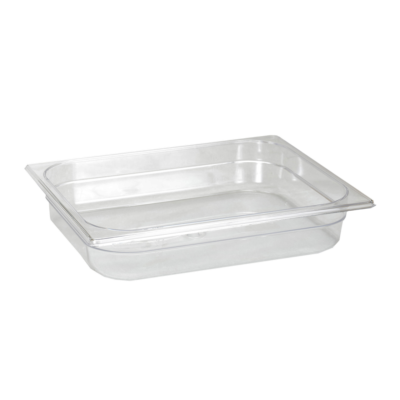 Polycarbonat Gastrobehälter GN 1/2, Tiefe 65 mm. GN sind mit einer Volumenmarkierung (l) ausgestattet. Temperaturbegrenzung von - 30 °C- + 100 °C.