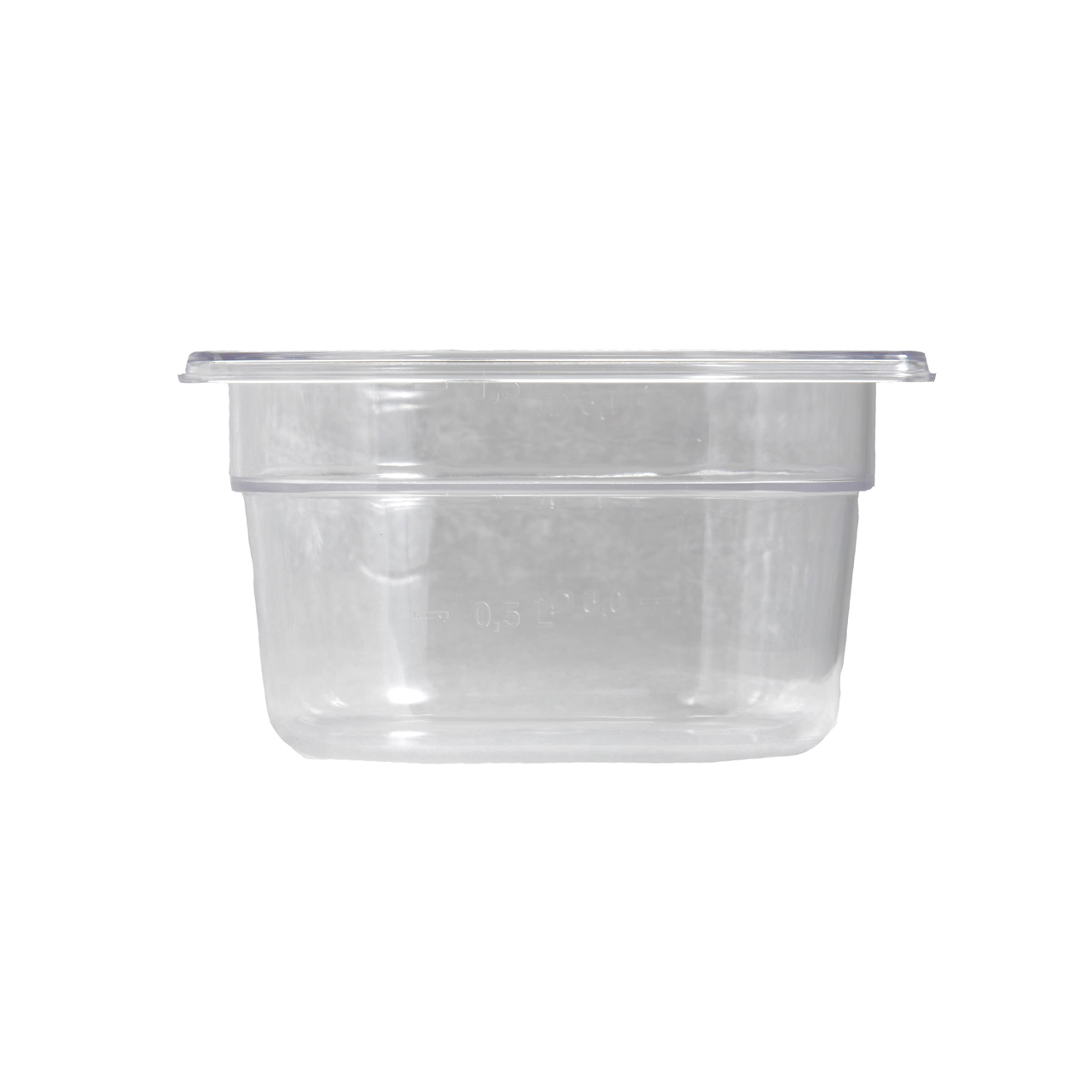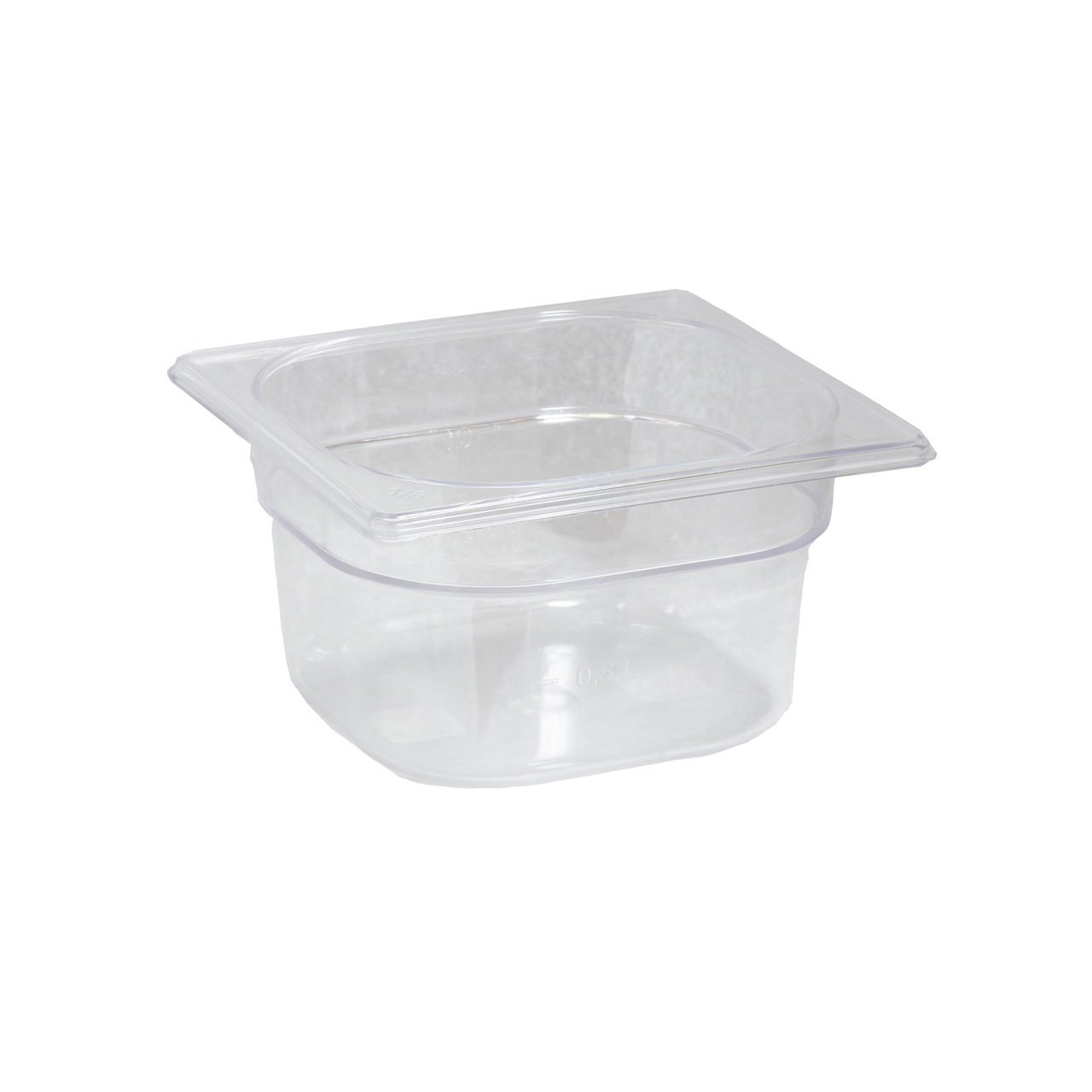 Polycarbonat Gastrobehälter GN 1/6, Tiefe 100 mm. GN sind mit einer Volumenmarkierung (l) ausgestattet. Temperaturbegrenzung von - 30 °C- + 100 °C.