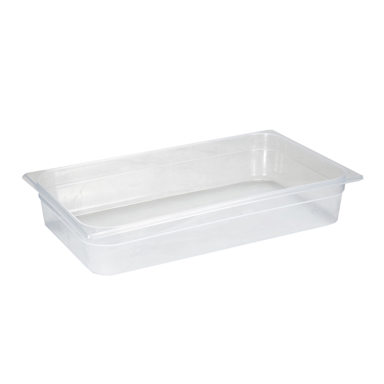 Gastrobehälter aus Polypropylen GN 1/1, Tiefe 100 mm. Sie eignen sich für den normalen Gebrauch, insbesondere für Gefrierschränke. Sie sind temperaturbeständig von - 30 °C bis + 70 °C.