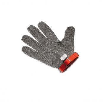 Der schnittfeste Metzgerhandschuh besteht aus Edelstahl-Drahtringen, die zusammen optimalen Schutz vor Schnittverletzungen bieten. Größe M. Für mehr Tragekomfort wird unter dem Metzgerhandschuh zunächst ein Baumwollhandschuh getragen, der die Hand warm hält. Anschließend wird ein Kunststoffhandschuh angezogen. Danach folgt der schnittfeste Metzgerhandschuh. Zum Schluss werden alle Handschuhe mit einem Handschuhspanner fixiert. Der Drahtdurchmesser der Ringe beträgt 0,8 mm, der Durchmesser jeder Öse 5,8 mm. Euroflex-Handschuhe sind durch einen farbigen Riemen entsprechend der Größe gekennzeichnet.