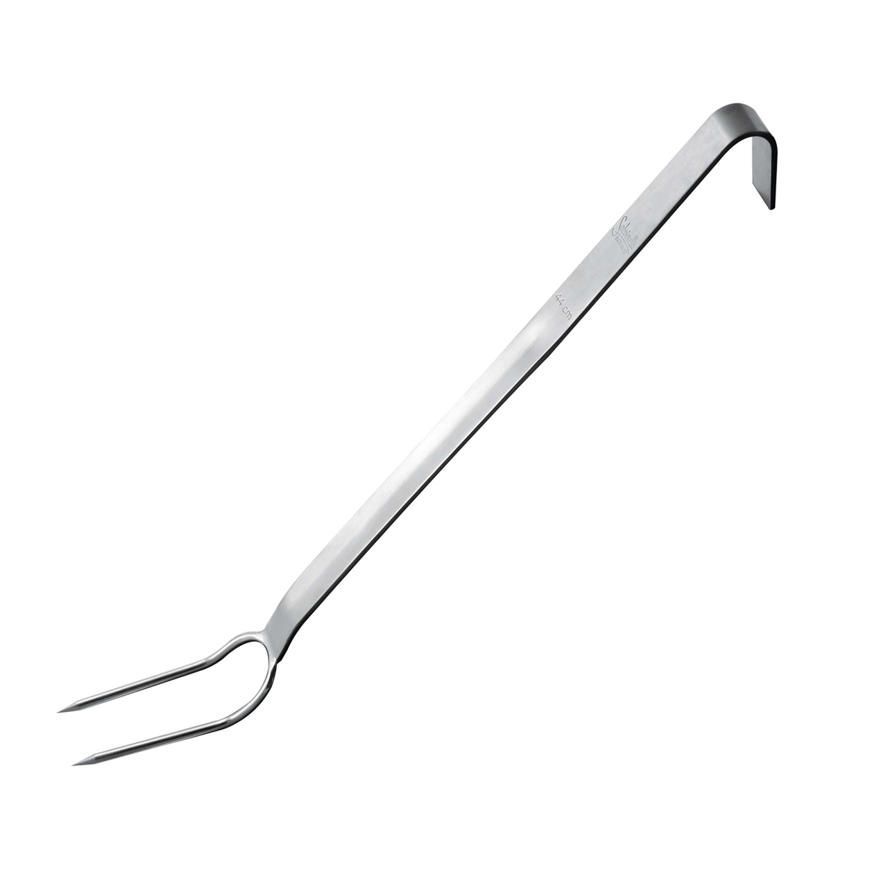 Massive Fleischgabel mit 2 Zinken, Materialstärke 3 mm. Zinkenlänge 11 cm, Grifflänge 35 cm.