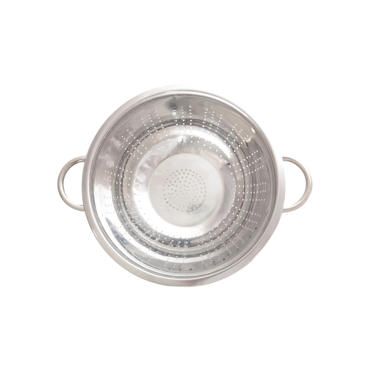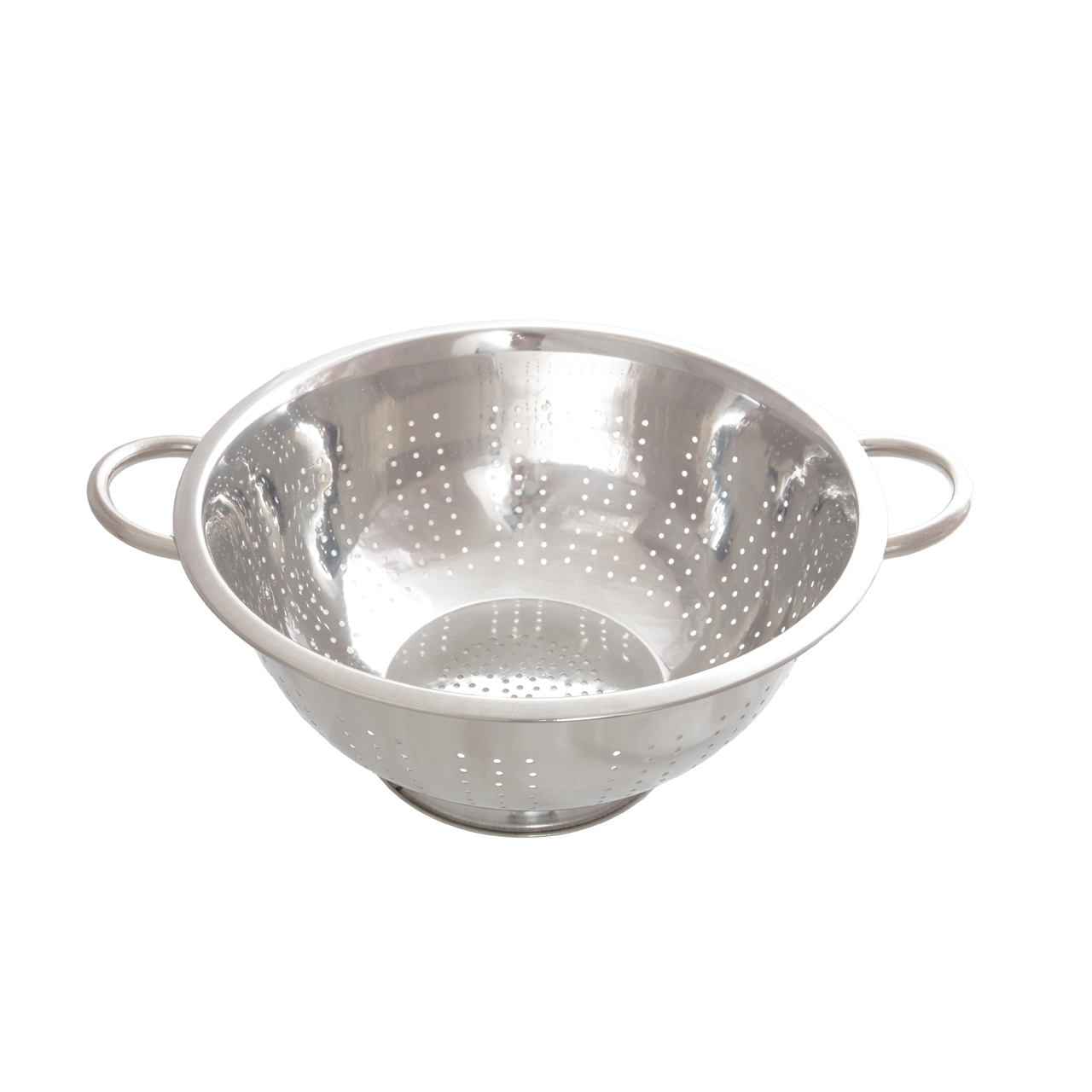 Das Sieb mit Fuß und zwei Griffen ist aus rostfreiem Lebensmittelstahl gefertigt. Geeignet zum Waschen von Gemüse.