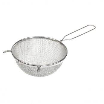 Zwei Arten von Metallgewebe, fest verbunden mit einem Stahlblechrand und einem Griff mit Stahldrahthaken. Oberstoff mit 6x 6 mm Maschenweite. Innengewebe mit 0,7x 0,7 mm Maschenweite, galvanisch beschichtet.