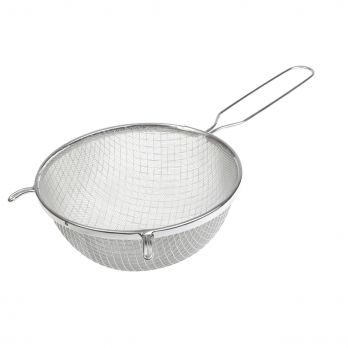 Zwei Arten von Metallgewebe, fest verbunden mit einem Stahlblechrand und einem Griff mit Stahldrahthaken. Oberstoff mit 6x 6 mm Maschenweite. Innengewebe mit 0,7x 0,7 mm Maschenweite, galvanisch beschichtet.