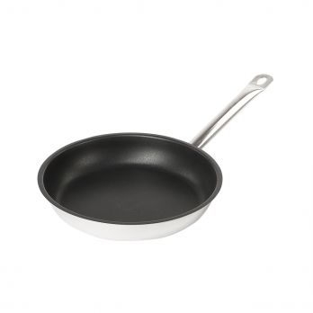Pfanne aus Edelstahl 18/10 mit Sandwichboden, beschichtet mit einer haltbaren Teflonoberfläche. Geeignet für alle Arten von Kochfeld ern. Spülmaschinenfest.
