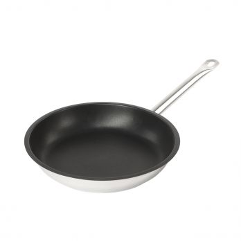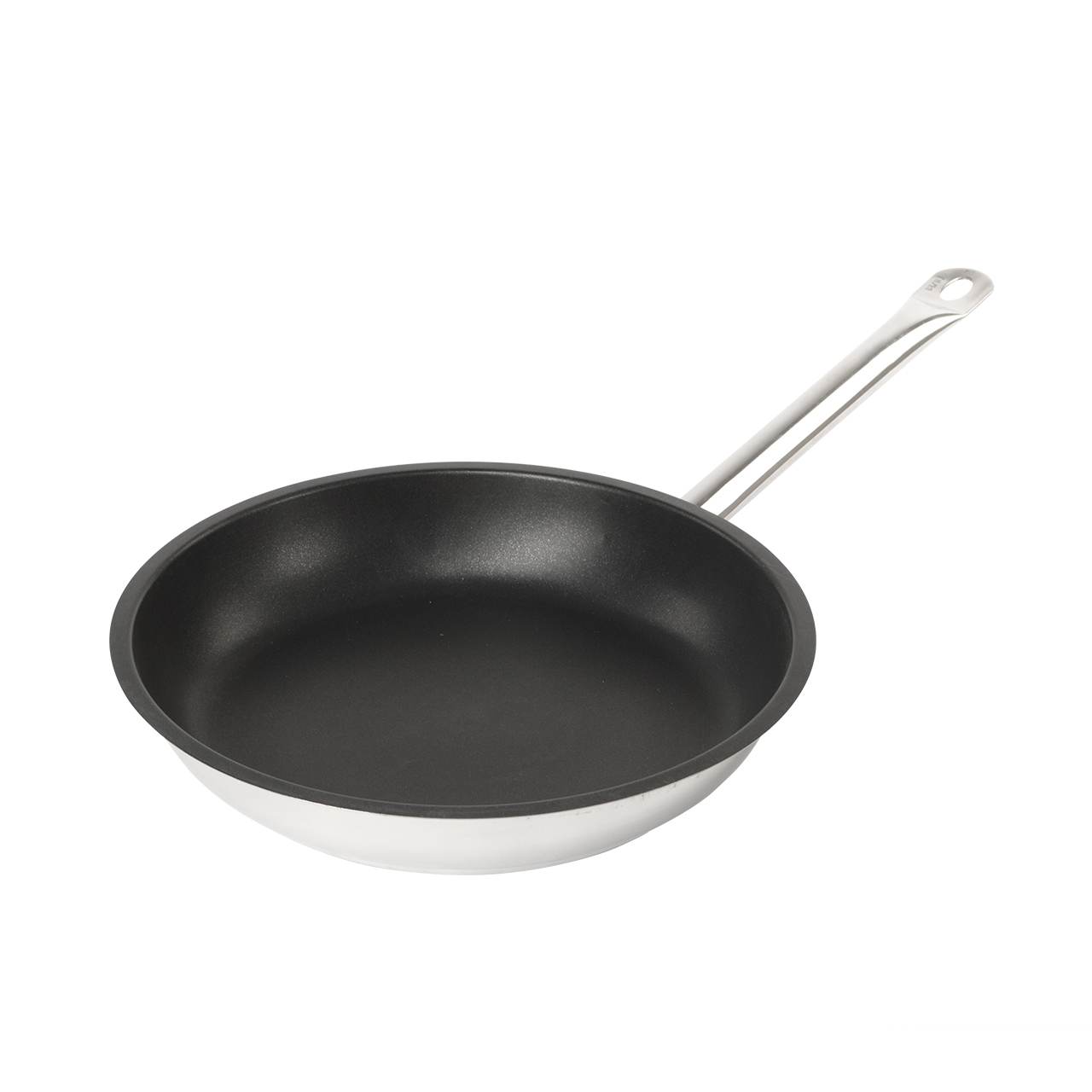 Pfanne aus Edelstahl 18/10 mit Sandwichboden, beschichtet mit einer haltbaren Teflonoberfläche. Geeignet für alle Arten von Kochfeld ern. Spülmaschinenfest.
