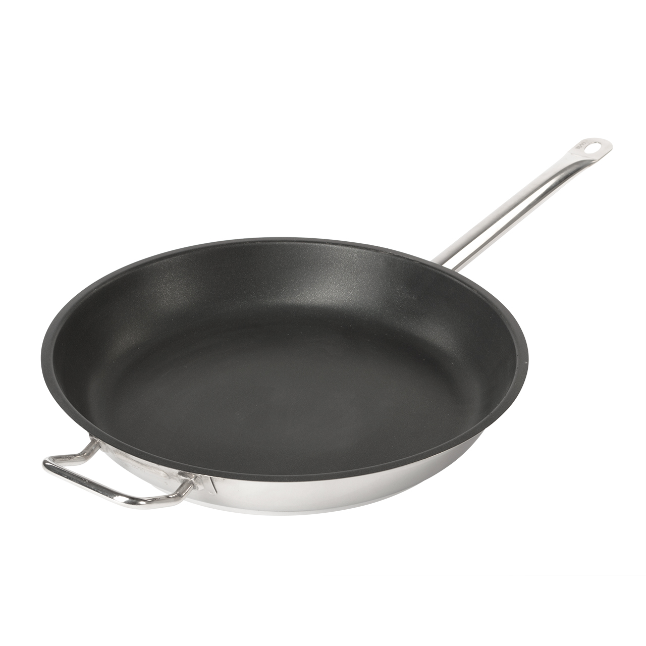 Pfanne aus Edelstahl 18/10 mit Sandwichboden, beschichtet mit einer haltbaren Teflonoberfläche. Geeignet für alle Arten von Kochfeld ern. Spülmaschinenfest.