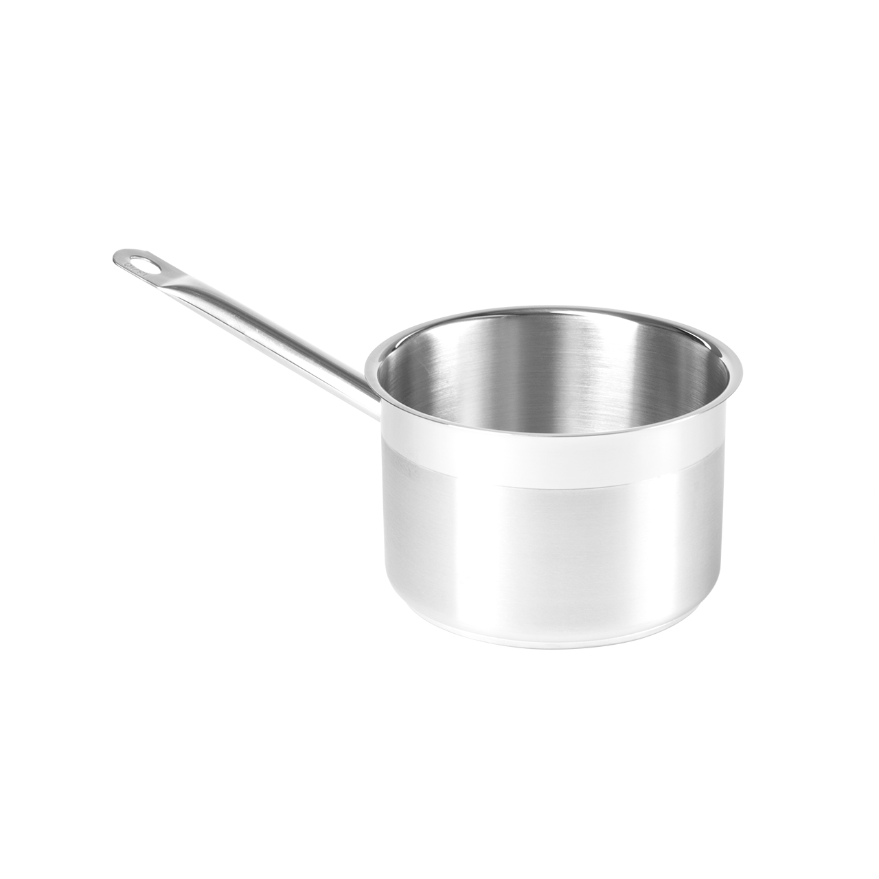 Der Topf ist aus hochwertigem 18/10-Edelstahl gefertigt, der eine lange Lebensdauer und Zuverlässigkeit garantiert. Er ist einlagig (6-8 mm dick) und hat einen dreilagigen Sandwichboden, der eine hervorragende Wärmeleitung gewährleistet. Der lange Griff liegt gut in der Hand und gewährleistet eine gute Handhabung. Fassungsvermögen: 2,75 l.