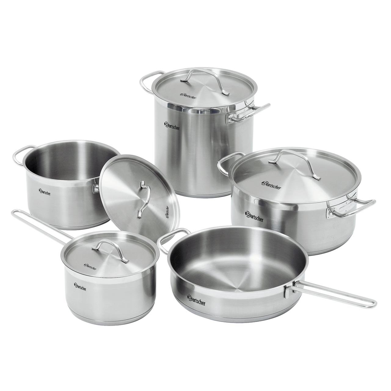 Neunteiliges Set Edelstahl-Töpfe mit Deckel von Bartscher. Die Töpfe sind aus Chrom-Nickel-Edelstahl gefertigt und für Gas-, Elektro- und Induktionsherde geeignet. Die Sicherheitsgriffe sitzen auf einem hitzebeständigen Boden.