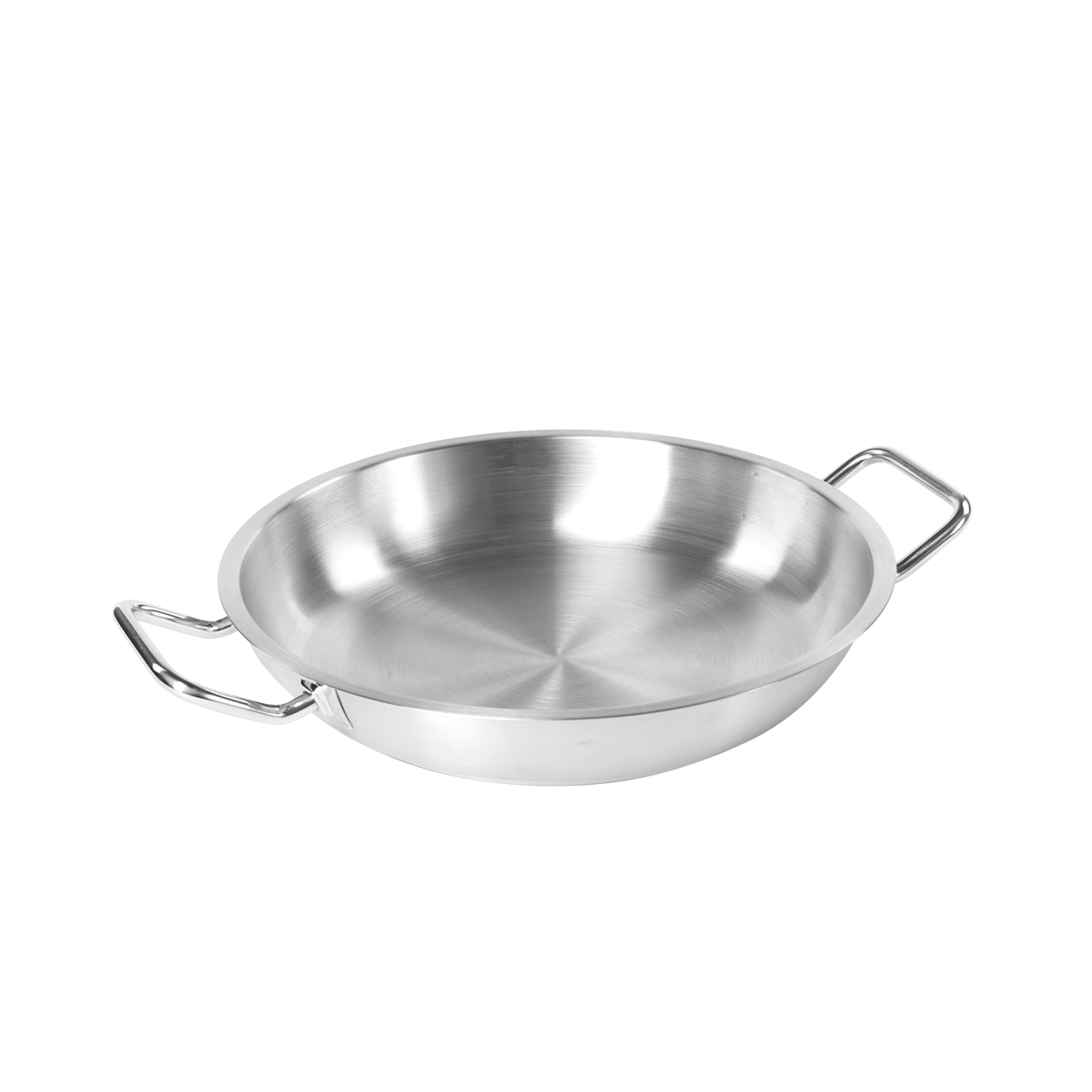 Paella-Pfanne aus Edelstahl 18/10 mit Sandwichboden, zwei Griffen, geeignet für alle Herdarten.