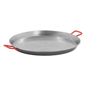 Pfanne mit hohem Rand und lackierten Griffen. Stahlpfanne mit strukturiertem Boden, ideal für die Zubereitung von spanischer Paella und anderen Köstlichkeiten. Hitzebeständige, rot lackierte Griffe. Durchmesser: 340 bis 800 mm. Leicht zu reinigen.