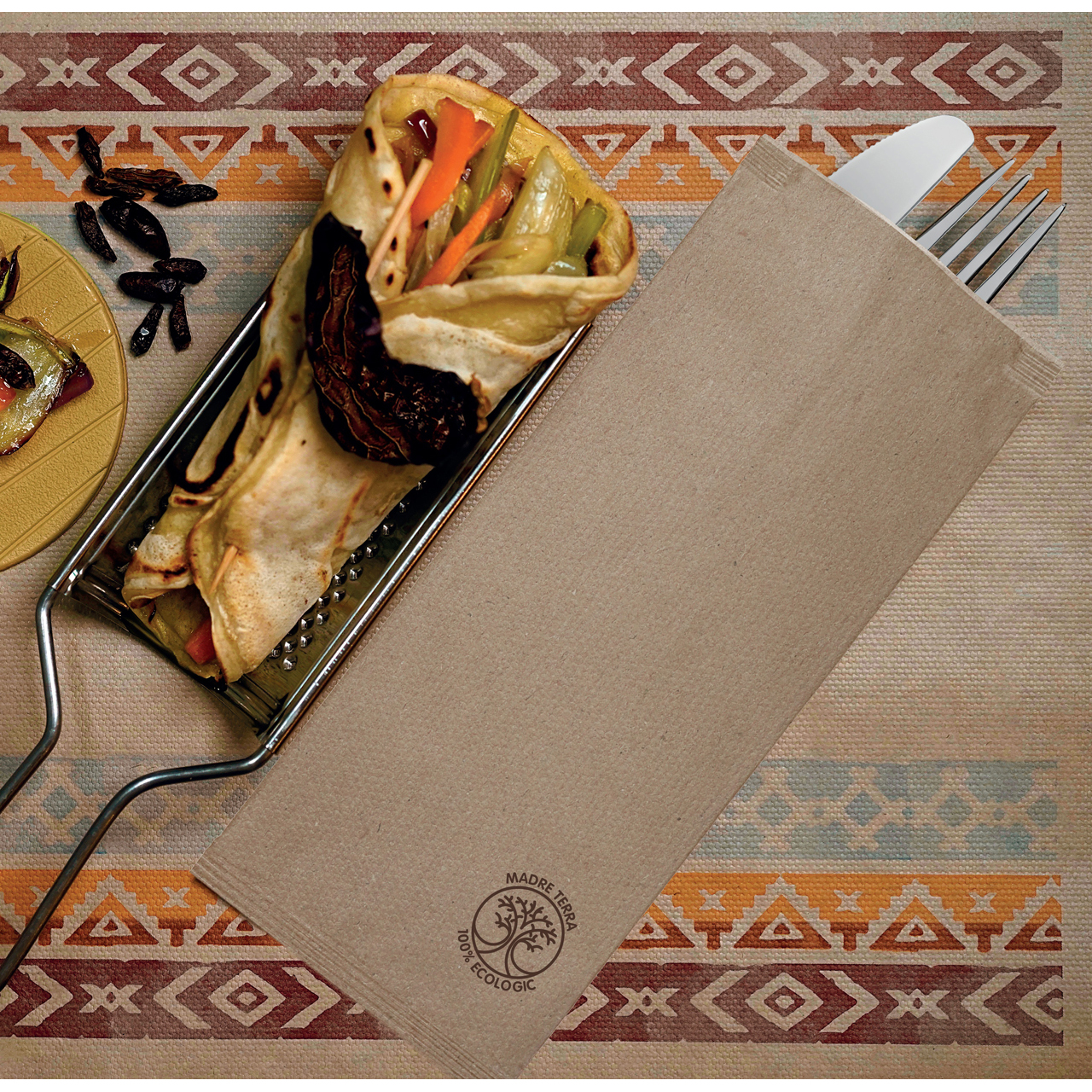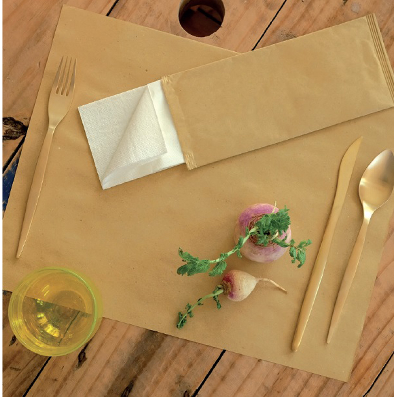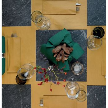 Geschlossene Papierbestecktasche (25 x 11 cm) mit einer eingelegten, hochwertigen, zweilagigen Serviette (38 x 38 cm, 1/8-Falz). Hygienisch und praktisch: Die Taschen sind ideal für unterwegs und lassen sich schnell und einfach handhaben. Das Besteck kann bereits vorab eingelegt werden, sodass keine Servietten mehr benötigt werden. Ein originelles Essaccessoire und eine praktische Lösung für die Tischdekoration im Freien.