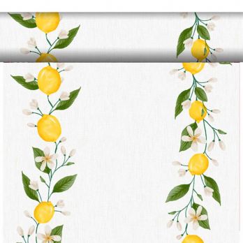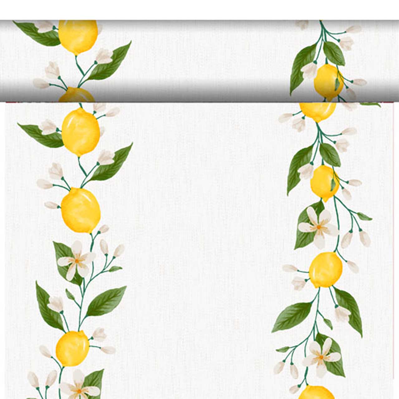 Ökologischer Tischläufer 0,4 x 24 m Lemon Fiesta. Frisches Zitronendesign für Sommer und thematische Essgruppen.