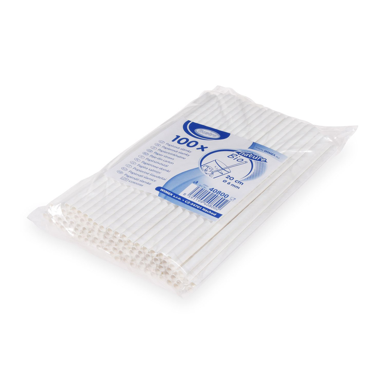 Papierstrohhalme gerade in Weiß. Die Packung enthält 100 Stück. Die Länge beträgt 20 cm und der Durchmesser 6 mm.