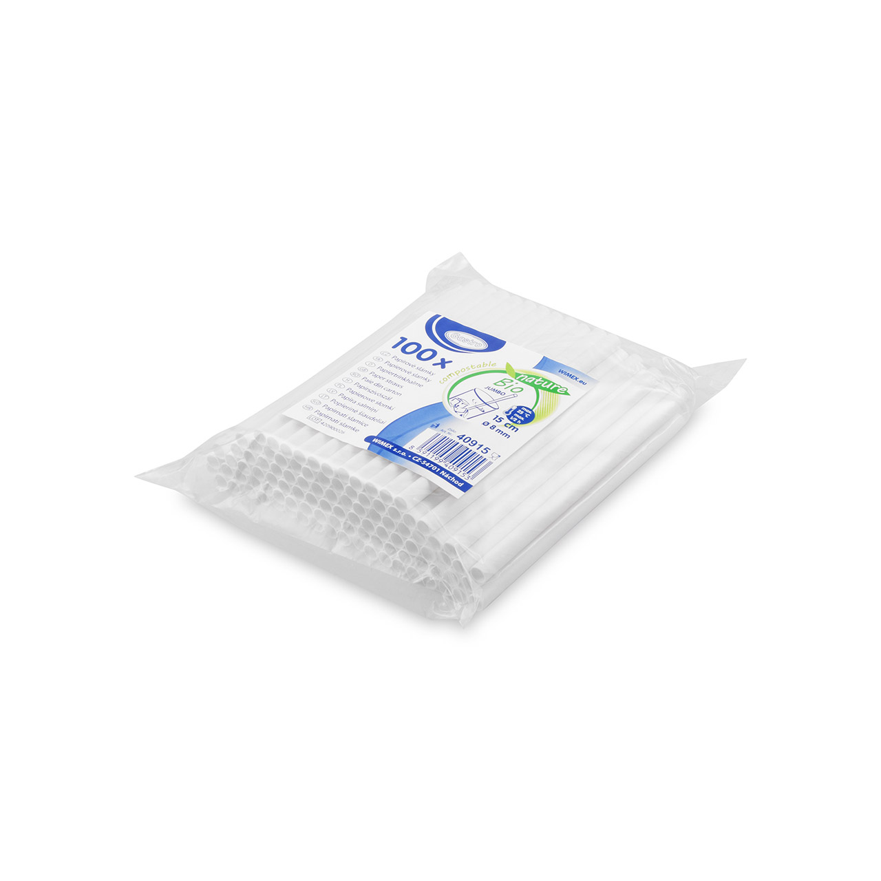 Papierstrohhalme JUMBO in Weiß. Die Packung enthält 100 Stück. Die Länge beträgt 15 cm und der Durchmesser 8 mm.