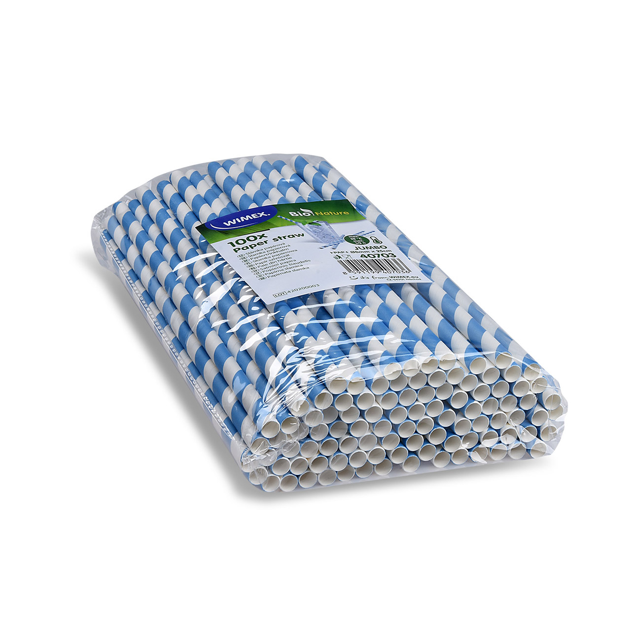 Papierstrohhalme JUMBO blaue Spirale. Die Packung enthält 100 Stück. Die Länge beträgt 25 cm und der Durchmesser 0,8 cm.
