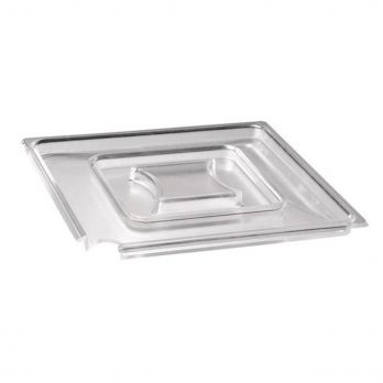 Deckel aus SAN-Kunststoff mit Aussparung für einen Löffel, Maße 25 x 25 cm.
