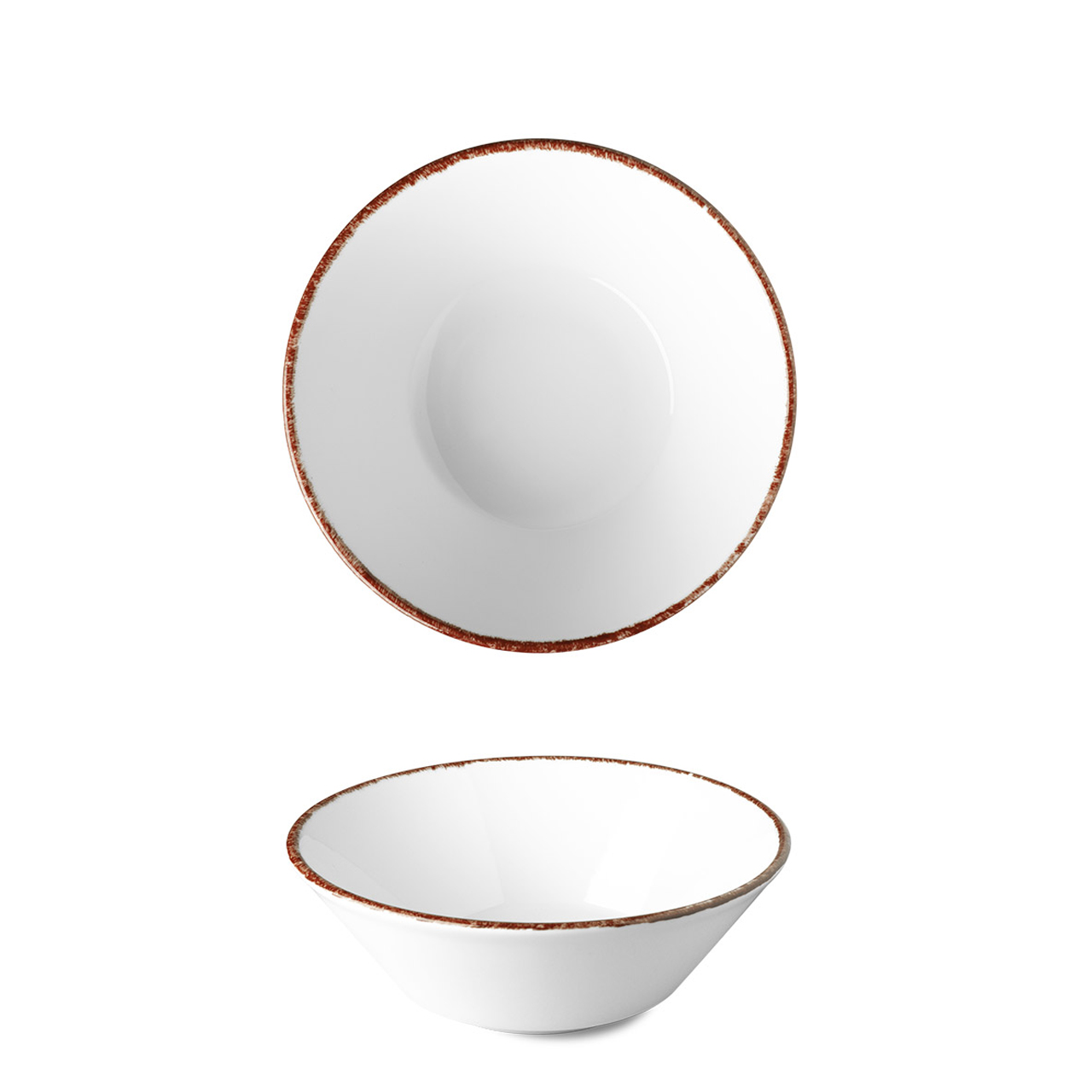 Weiße, konische Schale aus der Porzellanserie OPTIMO mit braunen Linien. Der Durchmesser der Schale beträgt 19,3 cm.