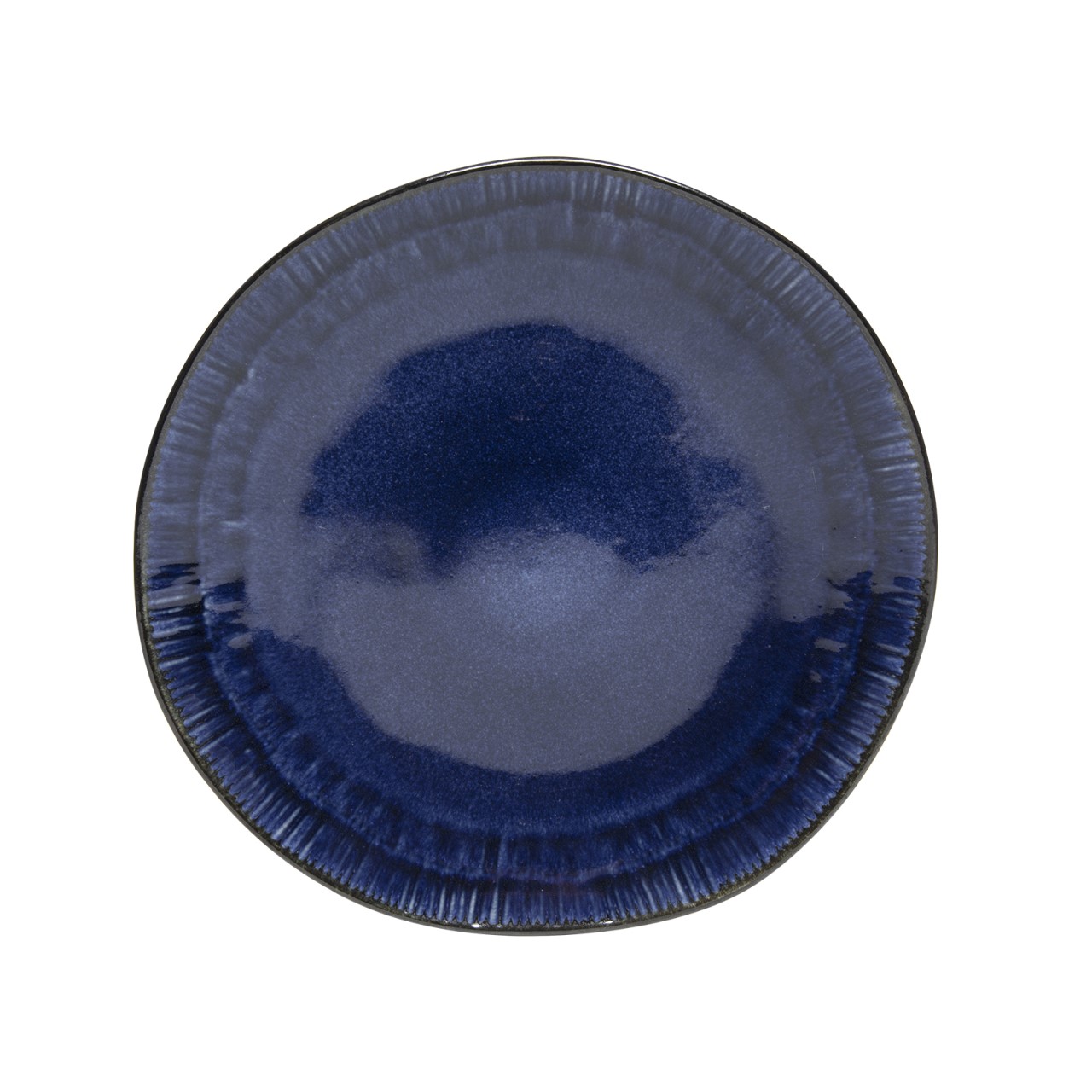 Ein flacher Teller mit einem Durchmesser von 27 cm mit unregelmäßigem Rand und einem unkonventionellen Dekor in Dunkelblau. Aus feiner Keramik.