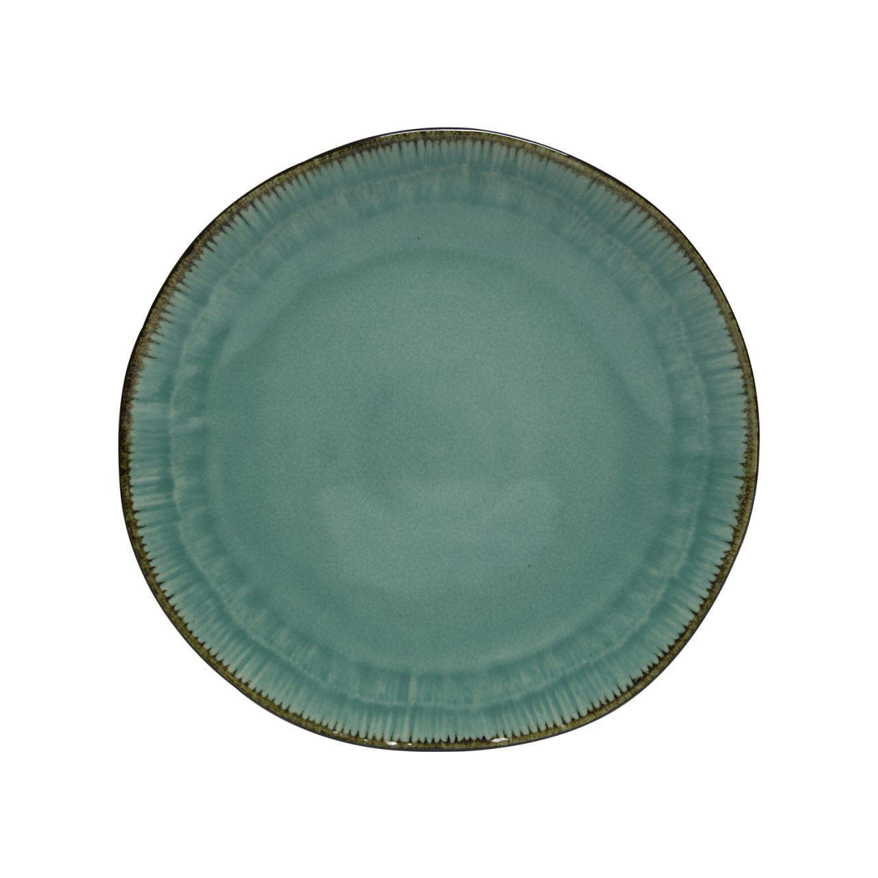 Ein flacher Teller mit einem Durchmesser von 27 cm, einem unregelmäßigen Rand und einem ungewöhnlichen Dekor in blaugrüner Farbe. Aus feiner Keramik.