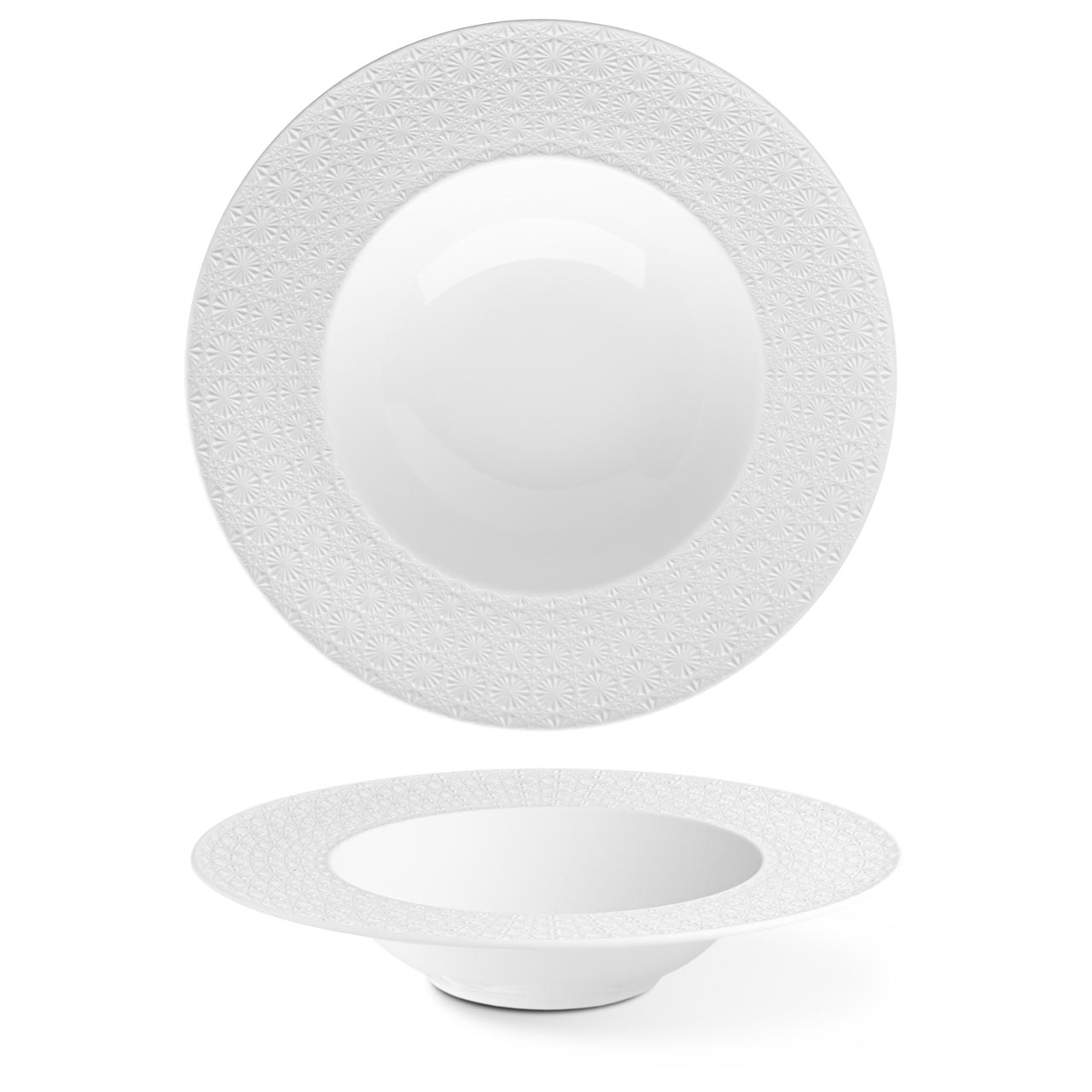 Tiefer Teller mit 27 cm Durchmesser. Eleganter Teller aus der Kollektion STARS mit unglasiertem Rand und einer Oberfläche in Natursteinoptik. Mikrowellen- und spülmaschinengeeignet.