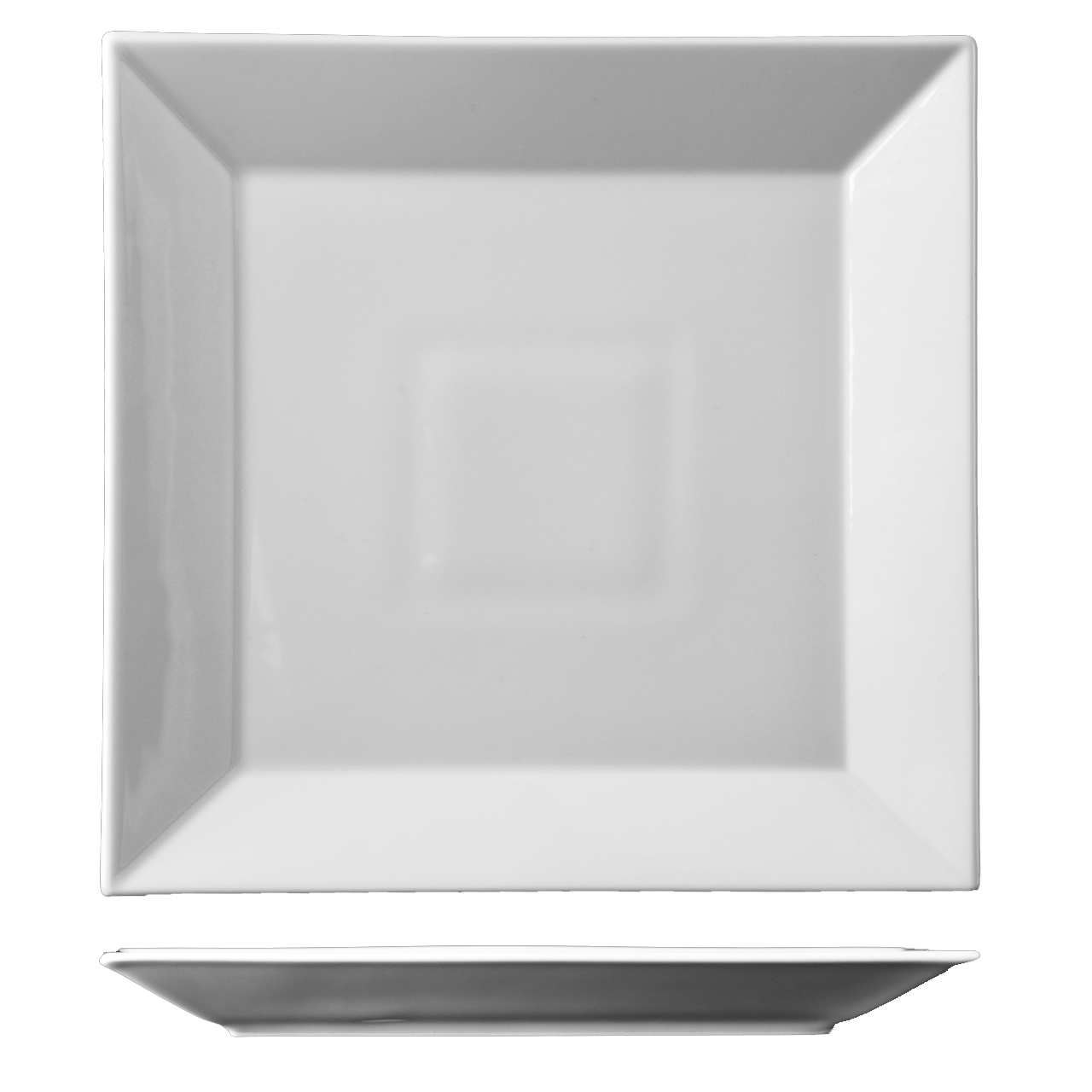 Quadratischer, flacher Teller in modernem Design mit einem Durchmesser von 27 cm.