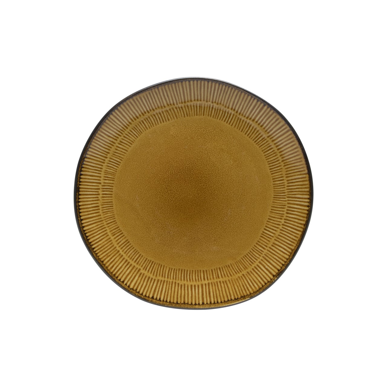 Ein flacher Teller mit einem Durchmesser von 22 cm, einem unregelmäßigen Rand und einem unkonventionellen Dekor in Ockerfarbe. Aus feiner Keramik.